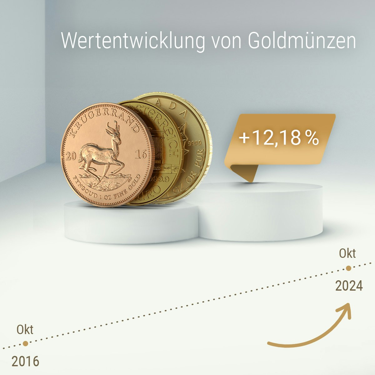 Die Wertentwicklung von Goldmünzen hat sich in den letzten Jahren äußerst positiv präsentiert. Zwischen Oktober 2016 und Oktober 2024 verzeichneten sie eine beeindruckende Steigerung von 12,18 %. Diese stabile Entwicklung ist ein deutliches Zeichen für die anhaltende Nachfrage nach Gold als sicherem Hafen in wirtschaftlich unsicheren Zeiten.