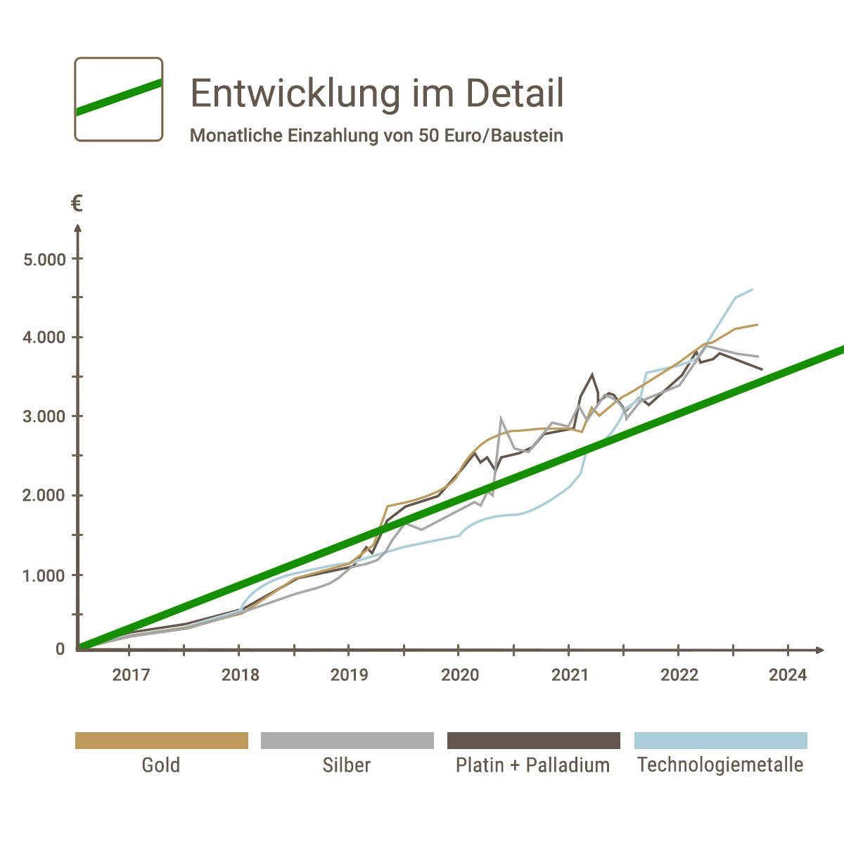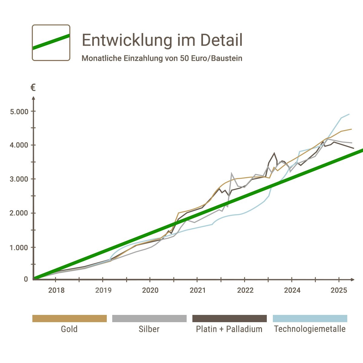 - Regelmäßige Käufe: Wir sind beständig im Einsatz und erwerben die Metalle regelmäßig für Sie, um ihr Investment so erfolgreich wie möglich zu gestalten.