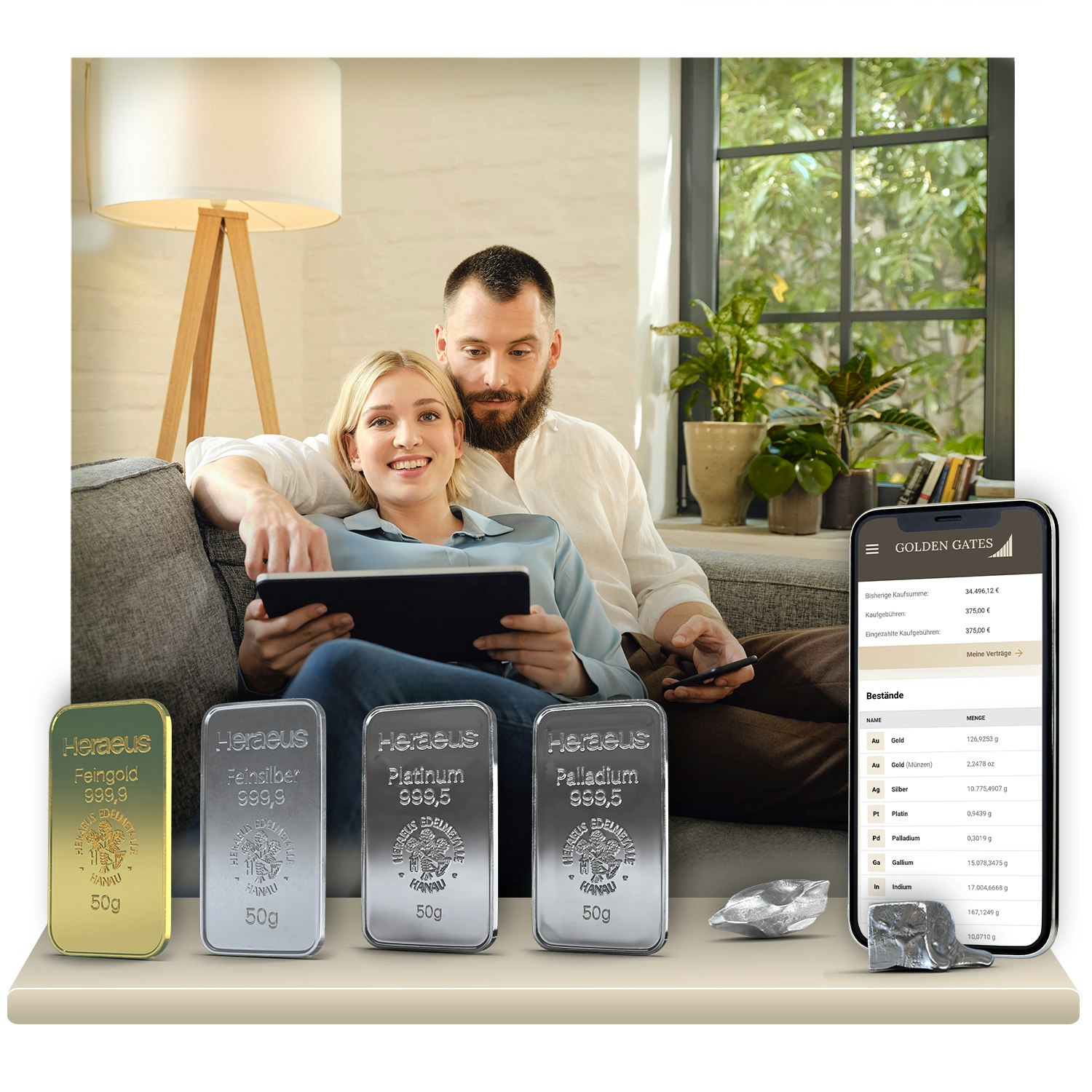 Ab einer Sparplan-Rate von nur 50 Euro monatlich können Sie durch Golden Gates Simple einfach und selbstbestimmt in Edelmetalle wie Gold, Silber, Platin und Palladium sowie in wichtige Technologiemetalle wie Indium, Gallium, Germanium und Hafnium investieren.